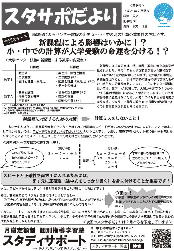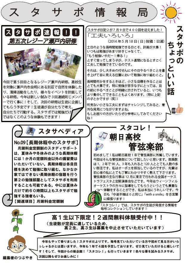今までに発行したスタディサポート通信「スタサポだより」のバックナンバーを掲載しています。 画像をクリックすると拡大してみていただけます。