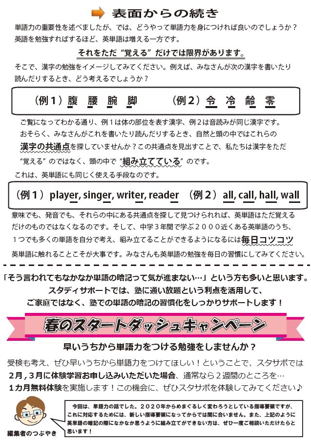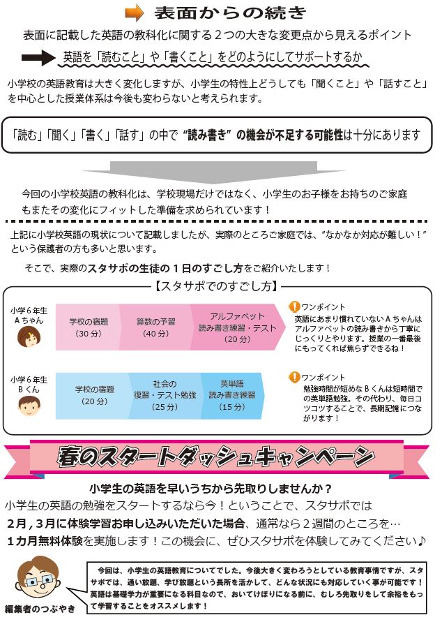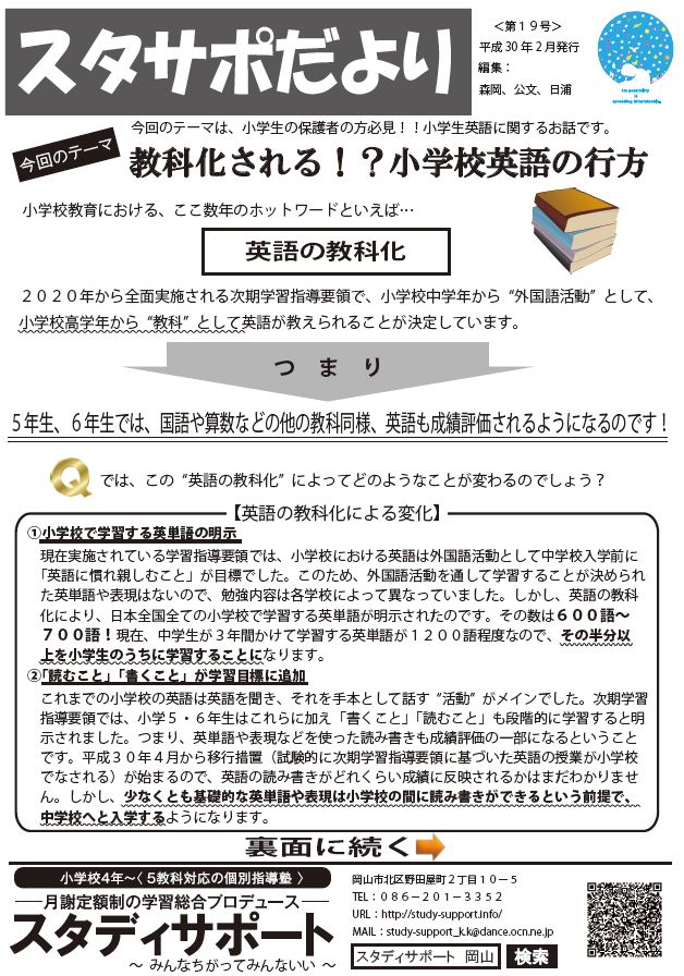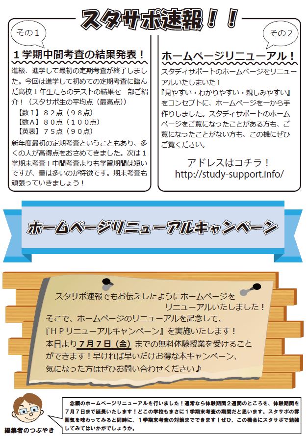今までに発行したスタディサポート通信「スタサポだより」のバックナンバーを掲載しています。 画像をクリックすると拡大してみていただけます。