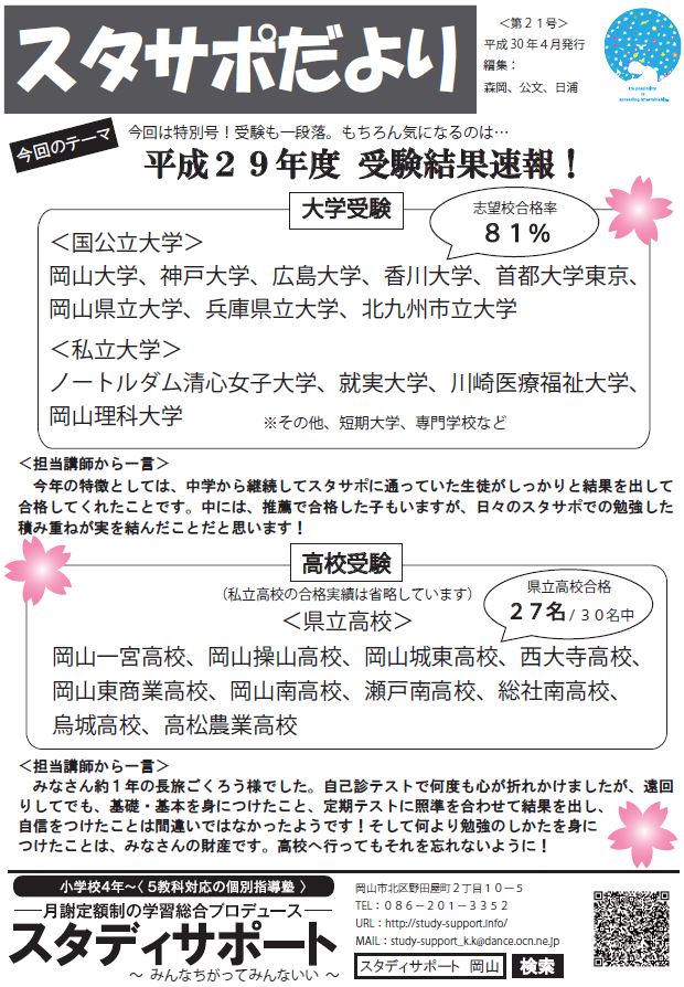 今までに発行したスタディサポート通信「スタサポだより」のバックナンバーを掲載しています。 画像をクリックすると拡大してみていただけます。