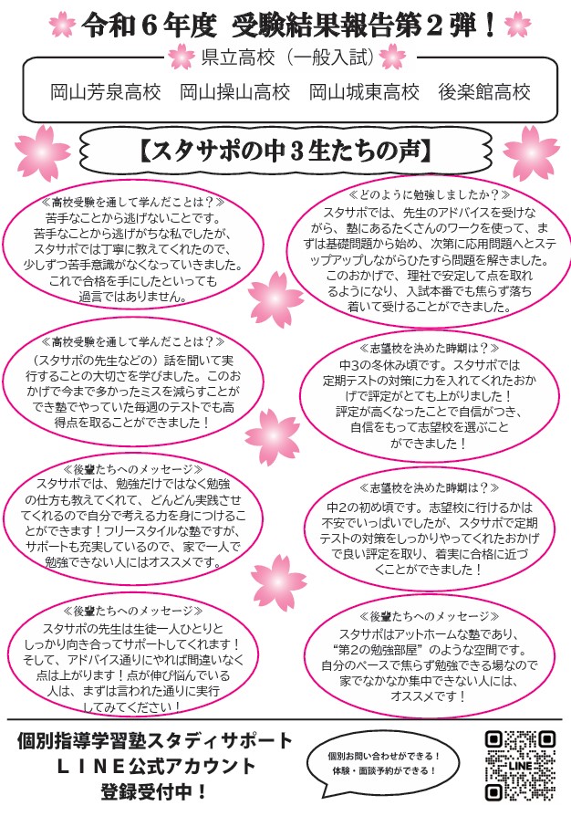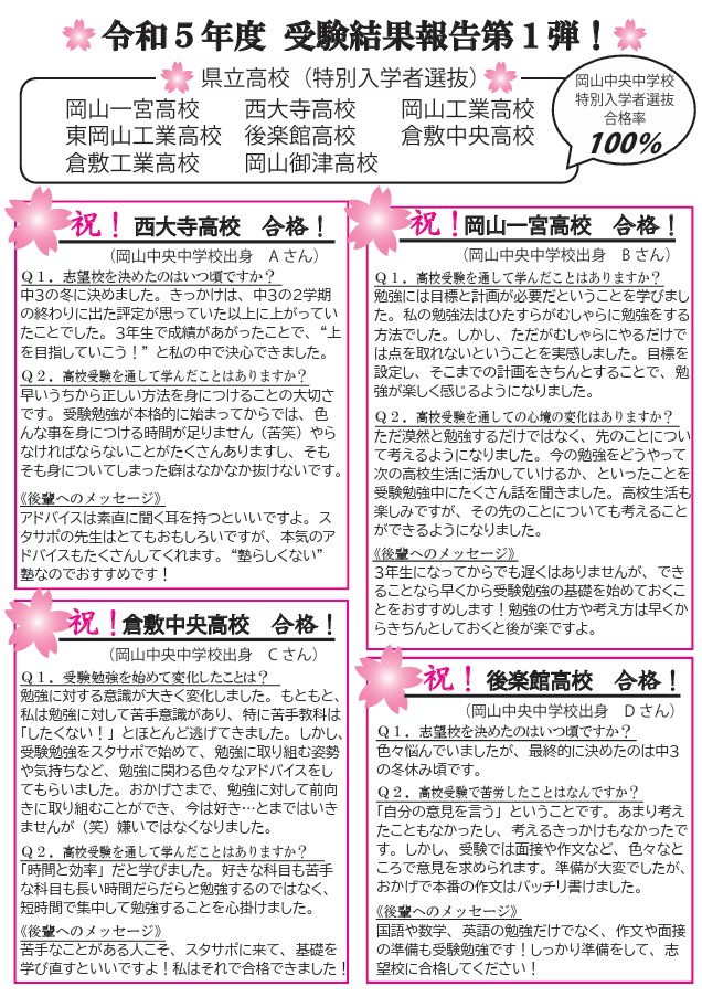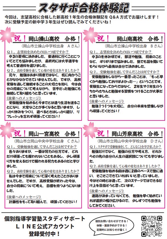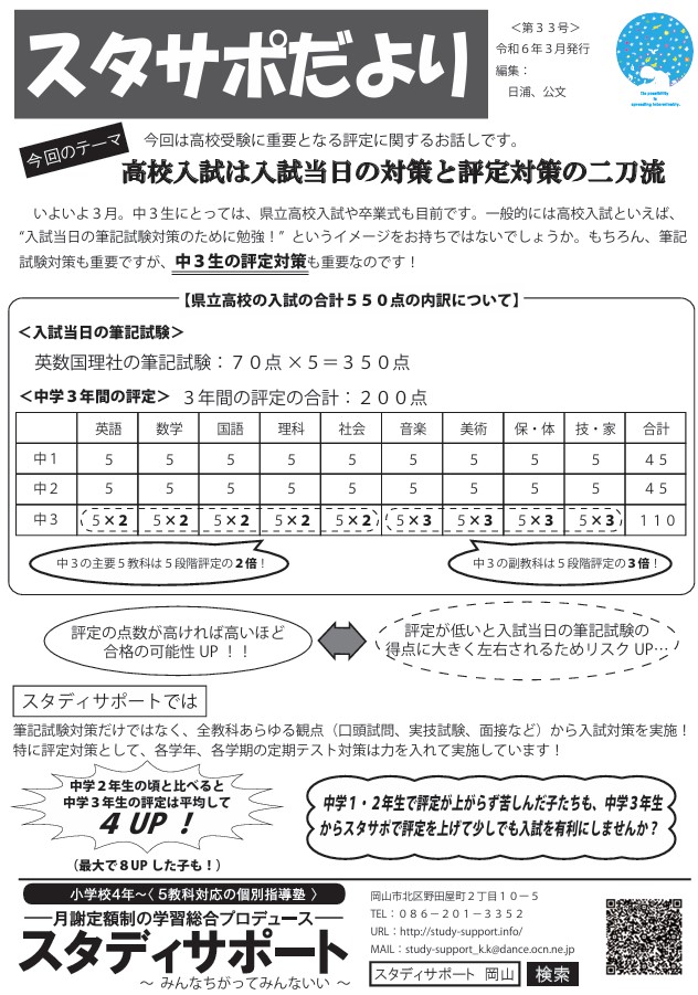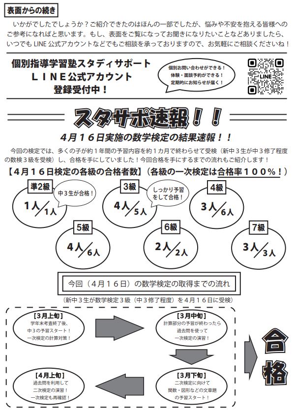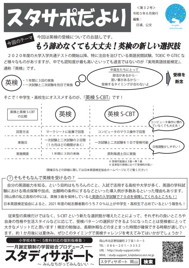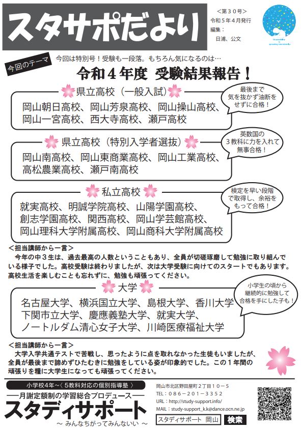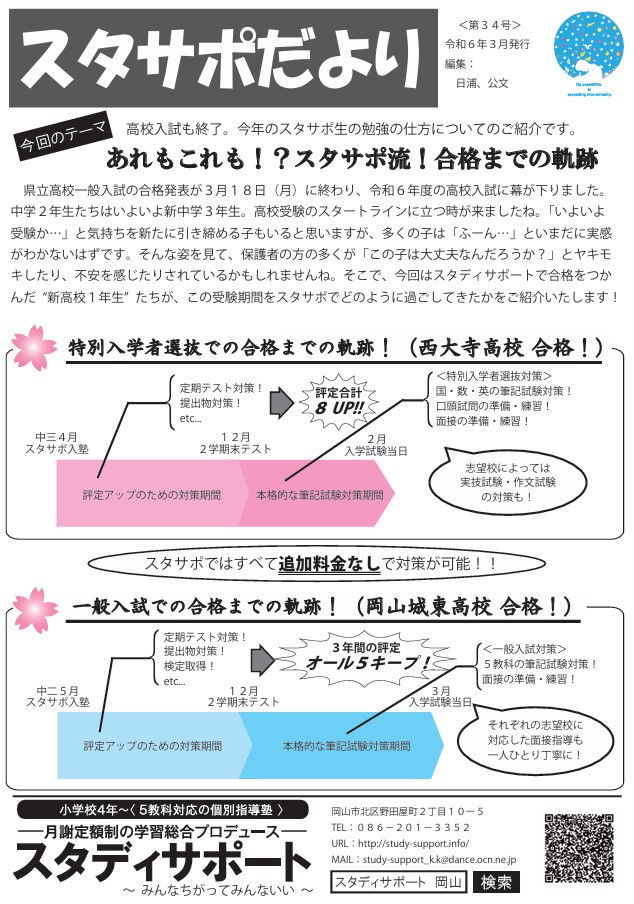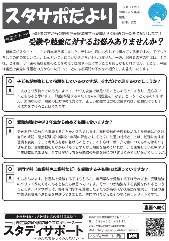 今までに発行したスタディサポート通信「スタサポだより」のバックナンバーを掲載しています。 画像をクリックすると拡大してみていただけます。