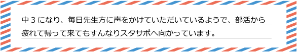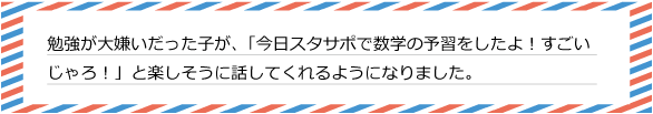 スタディサポートでは、毎月保護者の方とお手紙のやり取りをしています。その中から保護者様からの声の一部をご紹介いたします。